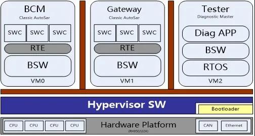 沒有一顆好大腦,再健壯的四肢也只能是擺設。為此,歐菲光采用了一顆高性能、大算力、多核的MCU大腦,并在底層軟件搭建Hypervisor(即虛擬機監視器),可允許多個VM虛擬機系統共享硬件,能讓集成系統“一心三用”,同時運行車身控制功能的 AutoSar系統、Gateway的AutoSar系統和運行診斷的RTOS系統三個獨立的VM虛擬機子系統,充分發揮各大硬件性能,高效智能掌控車身全域。